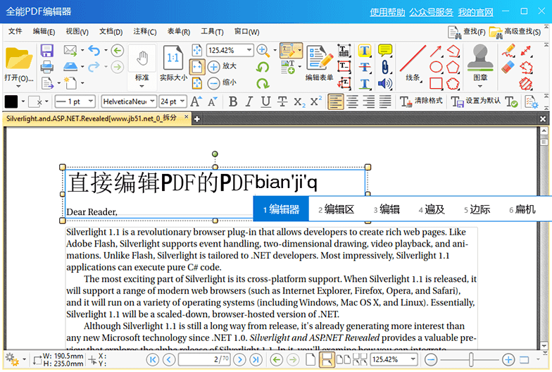 可以对PDF文件进行整体操作,如合并、分割、压缩、水印、加密等,也可以改变PDF原文,对原文进行重新编辑、排版、加入新图文、形状、链接、注释、图章、音乐等